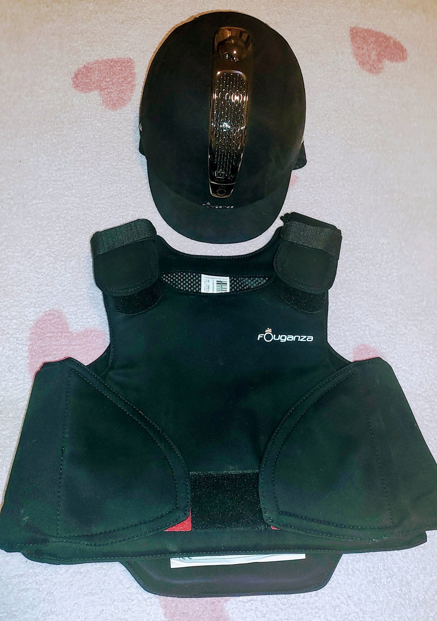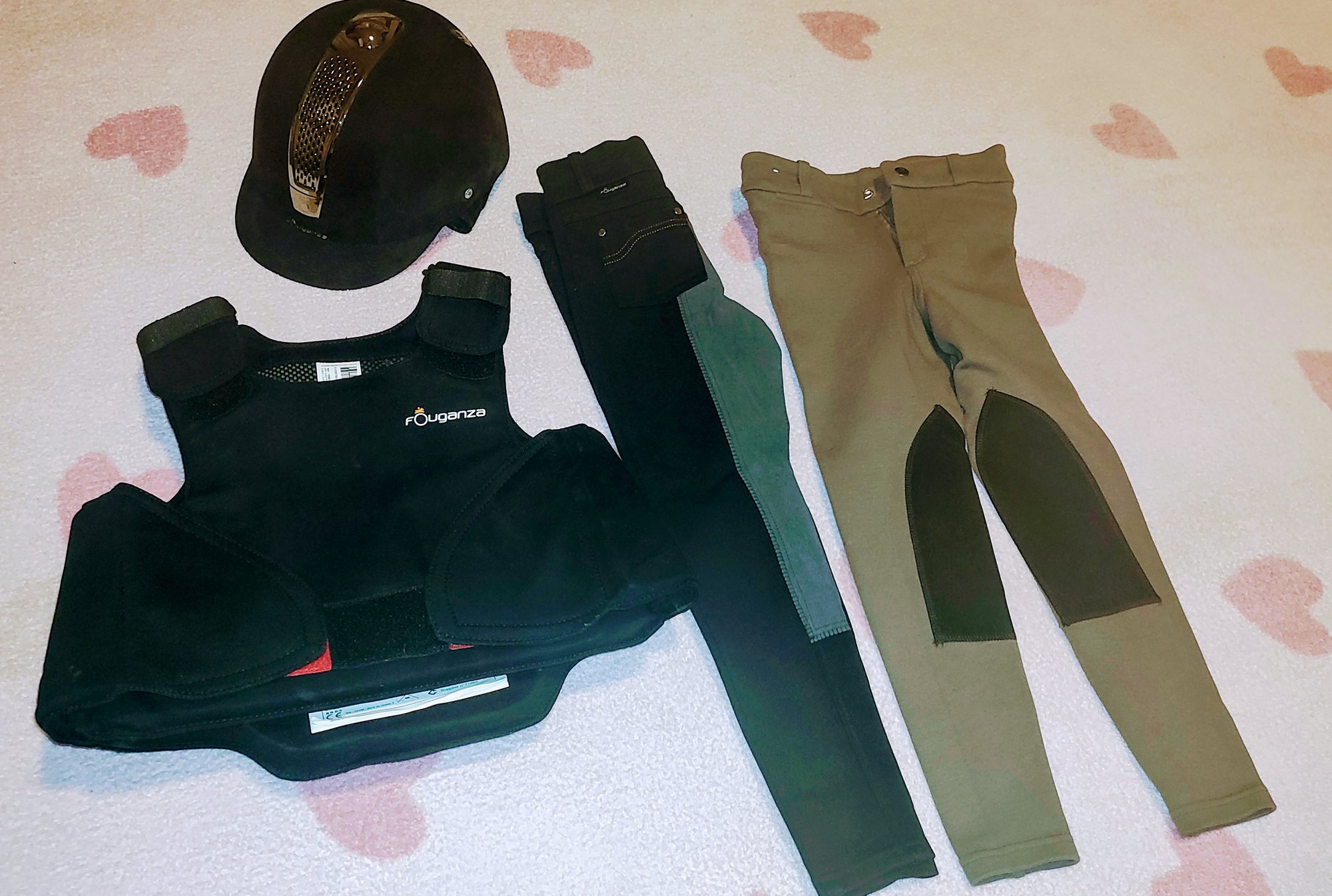Použito jen 1x. Dětské rajtky - černé a hnědé vel. 115-124; Dětské jezdecké boty - perka vel. EU 28; Jezdecká helma Fouganza vel. 52 cm; Dětská ochranná jezdecká vesta Fouganza nastavitelná na suchý zip věk 8-10 let.